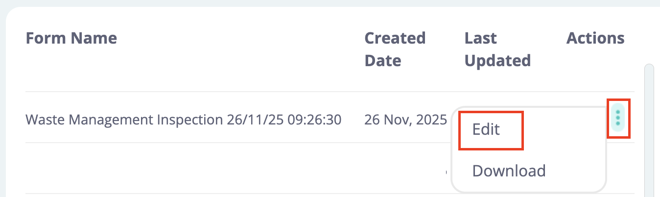 Or if you want to edit an existing form; go to the Saved Forms tab, find the form you want to edit, select the Actions button (⋮) and click on Edit.