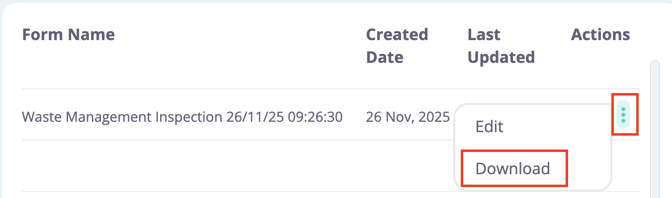 You can download any of your completed forms by going to the Saved Forms tab, finding the form you want to download, selecting the Actions button (⋮) and clicking on Download.